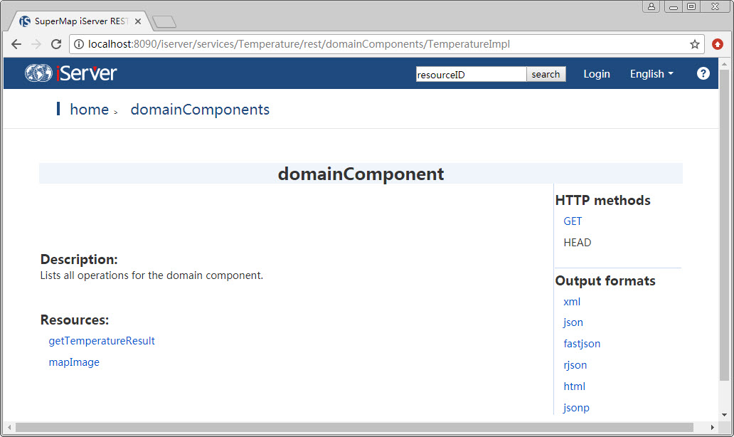 Click on the service link, and enter domainComponents, we can see the Temperature component has been published as a resource, and its methods have been published as resources too.