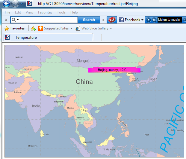 If one deploys weather query DSSs with the same service ability on two SuperMap iServer servers--C1 and S1 and accesses the following links:"http://C1:8090/iserver/services/Temperature/restjsr/Beijing" and "http://S1:8090/iserver/services/Temperature/restjsr/Beijing", both operations can get the weather report for "Beijing". The result (using C1 as an example) is shown as follows: