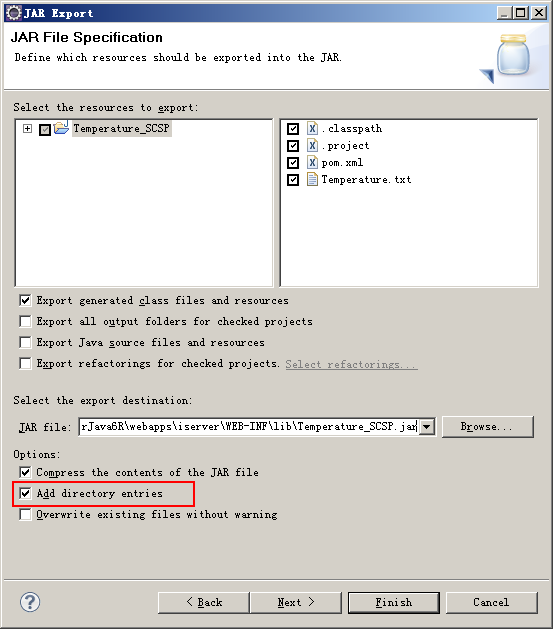 Note: When using Eclipse to package the Jar package, check Add directory entries, as shown below: